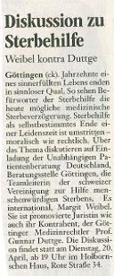 Die Unabhängige Patientenberatung Deutschland (UPD), Beratungsstelle Göttingen organisierte am 20.4.2010 eine Podiumsdiskussion über ein Tabuthema in Deutschland. Es diskutierten: Dr. jur. Margrit Weibel (EX International, Bern/Schweiz) und Prof. Dr. Gunnar Duttge (Zentrum für Medizinrecht, Universität Göttingen). Die Moderation übernahm Jürgen Gückel (Göttinger Tageblatt).