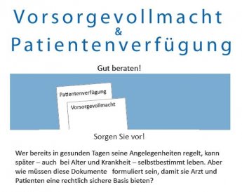 Patientenverfügung/Vorsorgevollmacht Vortrag mit RA Katja Kohler 16.06.21, 18.00 Uhr, ImPuls - Forum für Gesundheit und Prävention, Akazienweg 56 A Sorgen Sie vor! Wer bereits in gesunden Tagen seine Angelegenheiten regelt, kann später – auch bei Alter und Krankheit – selbstbestimmt leben. Aber wie müssen diese Dokumente formuliert sein, damit sie eine rechtlich sichere Basis bieten? Diese und andere Fragen beantwortete Katja Kohler aus rechtlicher Sicht. Flyer
