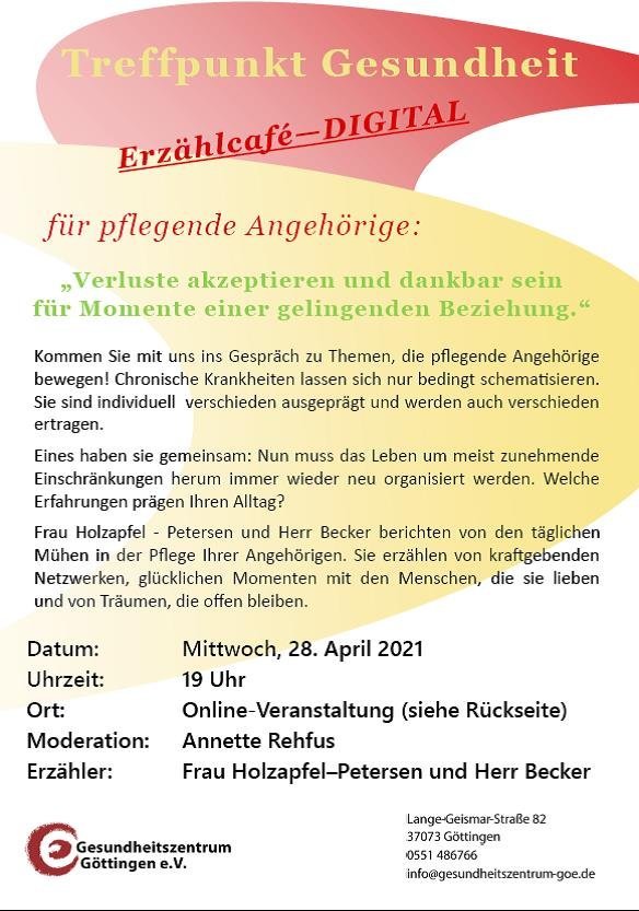 Treffpunkt Gesundheit - Erzählcafé Digital für pflegende Angehörige Moderation: Anette Rehfus Erzähler: Frau Holzapfel-Petersen und Herr Becker 28.04.21 um 19.00 Uhr „Verluste akzeptieren und dankbar sein für Momente einer gelingenden Beziehung.“ Es gab Gespräche zu Themen, die pflegende Angehörige bewegen! Chronische Krankheiten lassen sich nur bedingt schematisieren. Sie sind individuell verschieden ausgeprägt und werden auch verschieden ertragen. Eines haben sie gemeinsam: Nun muss das Leben um meist zunehmende Einschränkungen herum immer wieder neu organisiert werden. Erfahrungen des Alltags wurden ausgetuascht. Frau Holzapfel - Petersen und Herr Becker berichteten von den täglichen Mühen in der Pflege Ihrer Angehörigen. Sie erzählten von kraftgebenden Netzwerken, glücklichen Momenten mit den Menschen, die sie lieben und von Träumen, die offen bleiben. Flyer
