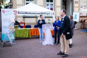 Thomas Markschies vom Gesundheitszentrum Göttingen e.V. eröffnete den Gesundheitsmarkt und entschuldigte Kreisrat Conrad Finger, der wegen einer akuten Erkrankung verhindert war. Er wies auf die neu erschienene Selbsthilfezeitung hin. Die "Wechselseitig" mit dem Motto "Die Kraft der Selbstfürsorge" ist ab sofort im Gesundheitszentrum Göttingen e.V. kostenfrei zu erhalten.