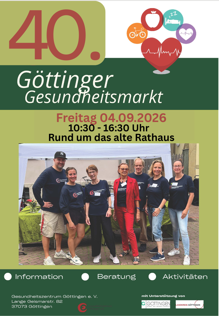 Aktuelles40. Göttinger GesundheitsmarktDer 40. Göttinger Gesundheitsmarkt findet am Freitag, 04.09.2026von 10.30 - 16.30 Uhr nicht wie in den letzten Jahren rund um die Johannisksirche, sondern zu diesem Anlass zentral rund um das alte Rathaus statt. Anmeldung unter: info@gesundheitszentrum-goe.de Anmeldeformular